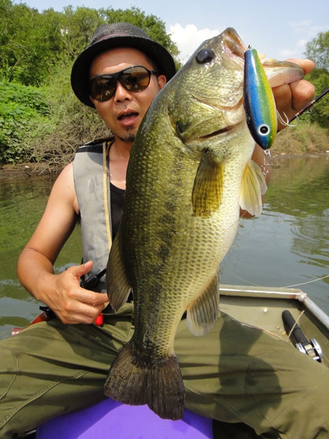 夏の川。ドピーカンの11時ごろに、水辺にせり出したブッシュの下から引きずり出した会心の1本。 実は、びっくりしてランディングは同船者にしてもらったという1本。。。